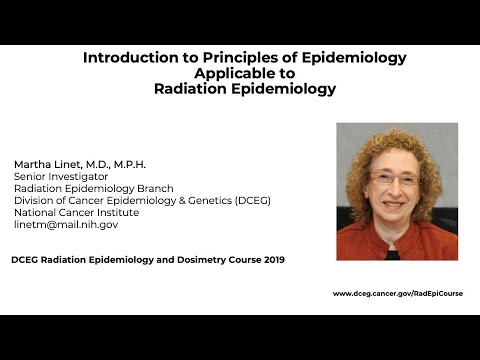 Dr. Martha Linet presents a brief overview of epidemiologic concepts, study design, and study components pertinent to radiation epidemiology. Lecture covers: epidemiology: history & definitions; descriptive patterns; disease models and causation; exposures & outcomes: sources and assessment methods; study designs; and confounding, effect modification, bias.